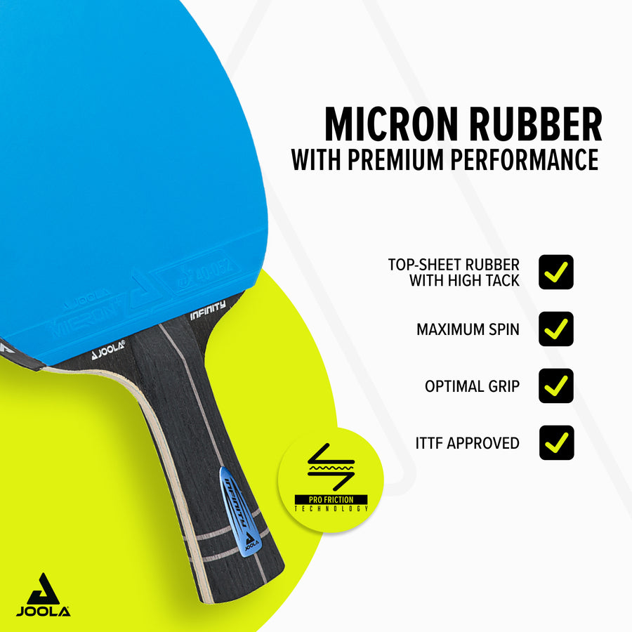 - ITTF-approved MICRON Rubbers: Thanks to PRO FRICTION technology, these rubbers offer excellent spin and speed characteristics, ideal for a dynamic and offensive style of play.