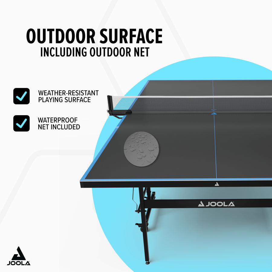 The JOOLA Outdoor J100A combines durability, flexibility, and excellent playing characteristics – turning your terrace or garden into a table tennis arena for family and friends!