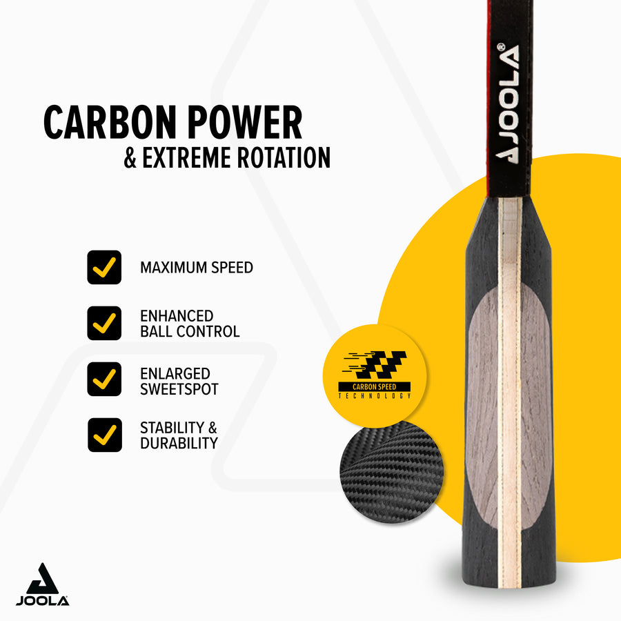 - Powerful carbon fibers: The CARBON SPEED fabric in the blade enhances stability, increases the optimal hitting surface, and enables powerful attacking shots.