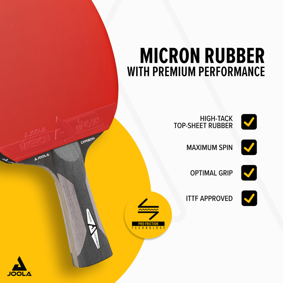 - ITTF-approved MICRON rubbers: Thanks to PRO FRICTION technology, these rubbers offer excellent spin and speed characteristics, ideal for a dynamic and offensive playing style.